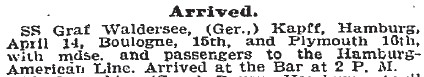 I again searched in vain for Graf Valdez. Then I searched on Valdez, and found a lot of people, and Graf, and found a lot of ships and other hits. But no Graf Valdez. I finally looked at the original Hungarian in the diary. The ship reference seems to be “Graf valderse.” I recalled coming across the ship name Graf Waldersee. Could this be it?